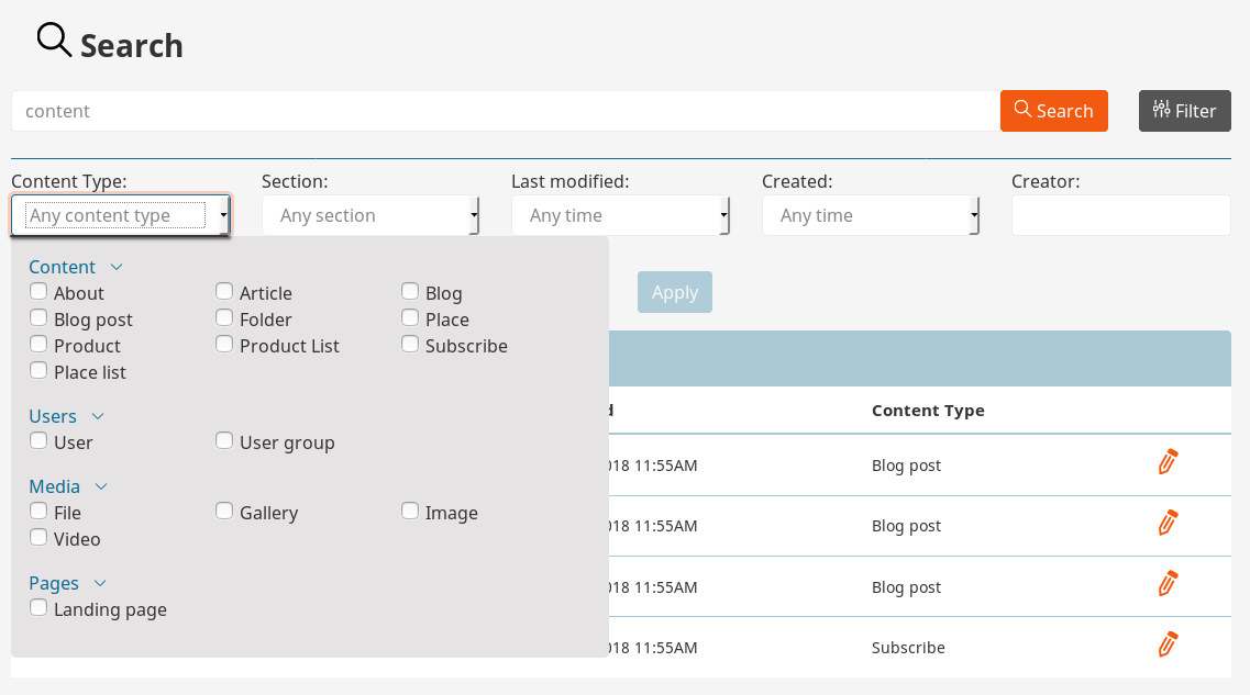 All new or custom Content Types and Sections are automatically added to the drop-down filter lists.